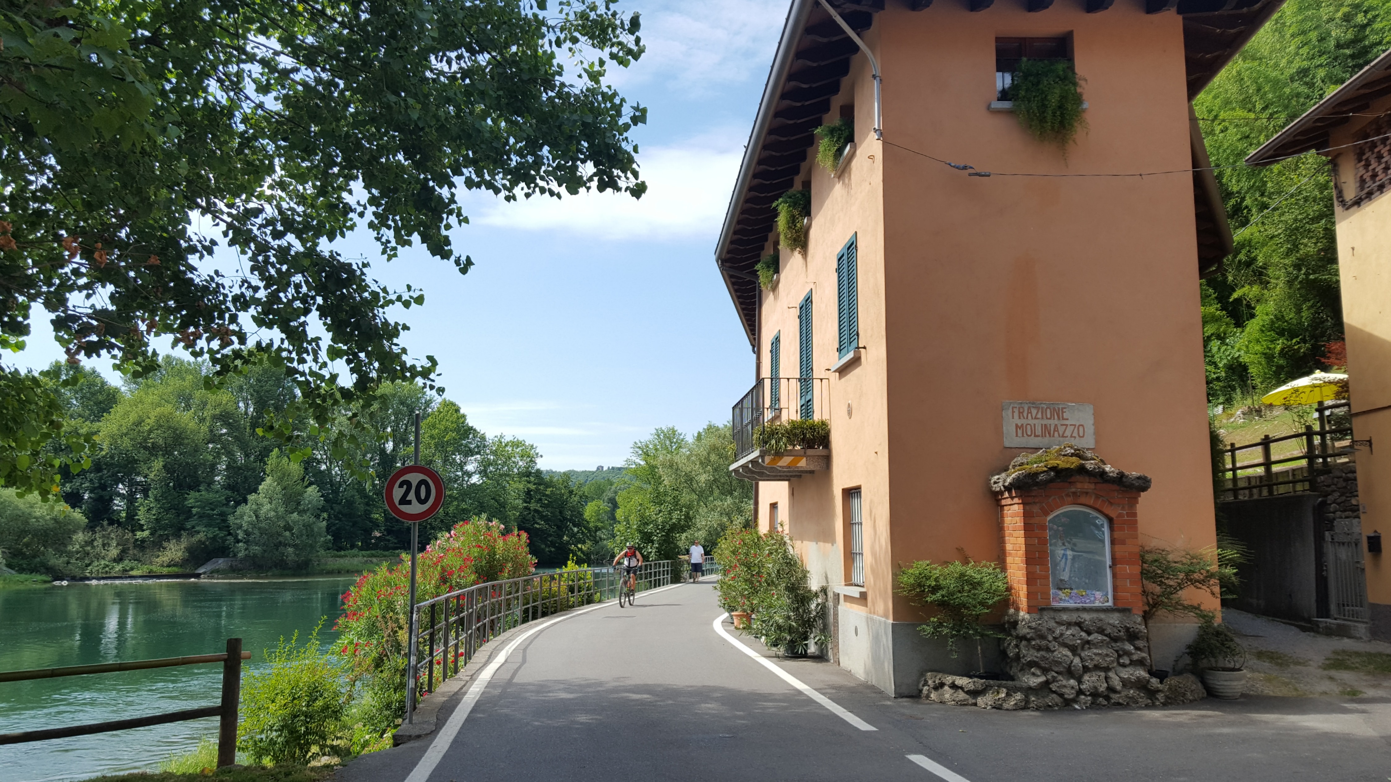 - Continue opposite on via Martiri della Liberta and then on the dirt track of via Lungo Lago next to a health trail that makes a loop before a water treatment plant. At the end of Lake Olginate and the industrial area, continue in the countryside on the track parallel to via dell Industria, pass under the pedestrian/bicycle footbridge, under the railway track by strada Alzaia and then under the suspension bridge of the SP74. Continue the track on this shaded shore, pass by a last factory (Costacurto Spa-Vico) to find the calm and noise of the water. Follow the Adda which makes a first meander and then a second meander as it approaches the SP72. Follow the dirt track along the waterfront to Brivio, the next village behind the third bend of the river.