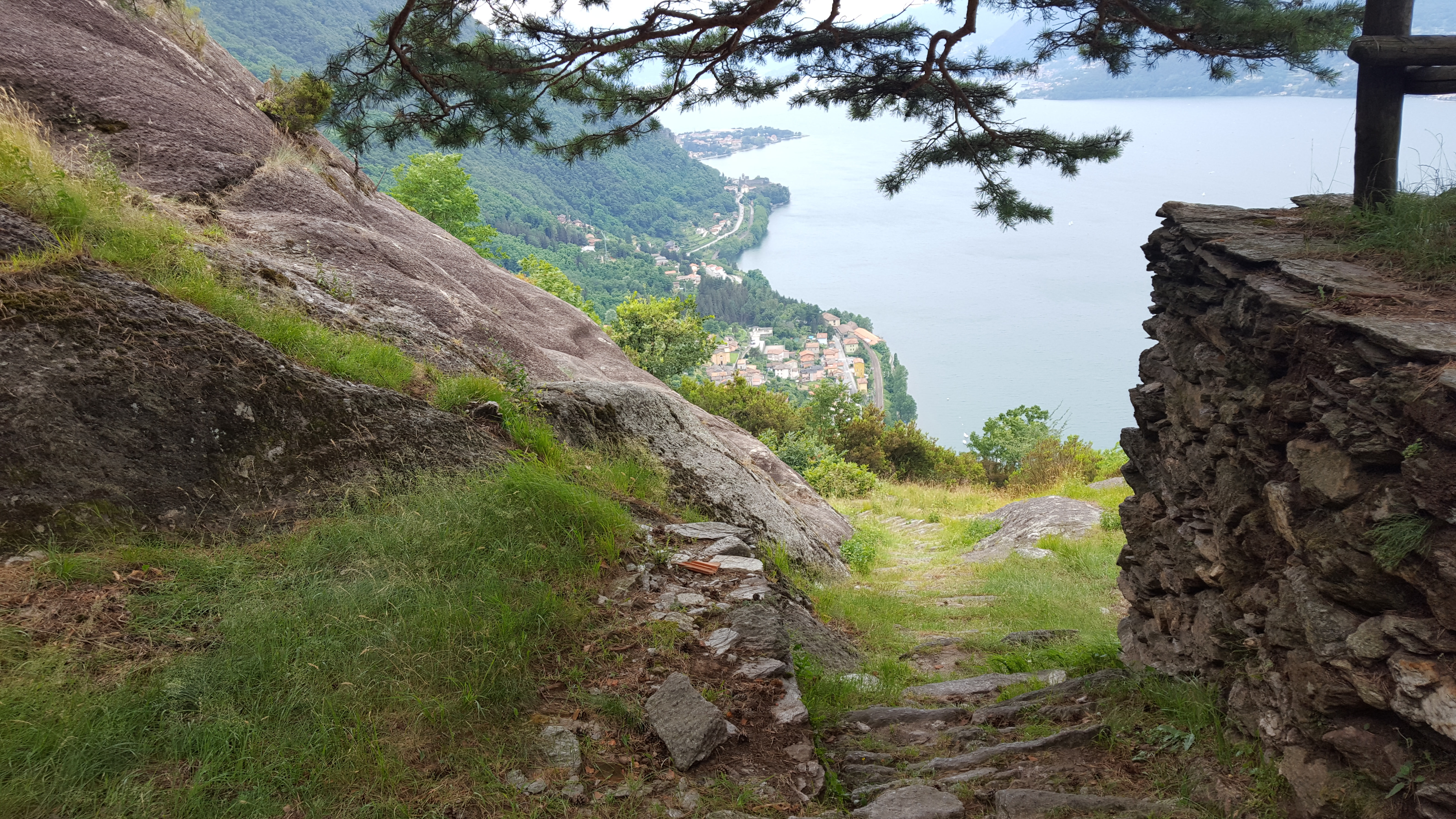 2. All'uscita di Dervio segnata dal passaggio della strada sotto il binario ferroviario, prendere a sinistra una scala segnata Sentiero del Viandante "SV" che sale verso Chignolo. Godetevi questo percorso con cura per la sua vista sul lago e per la sua realizzazione, sia scavata nella roccia, sia su una terrazza con muri di sostegno, tra giardini e terrazze coltivate a vite, ulivo e palme. Dopo una roccia incisa nel 1693, si passa sopra le case di Ronchi, poi davanti ad una cappella barocca prima di raggiungere il solco del torrente Valle Grande, che confina con i paesi di Dervio e Bellano.